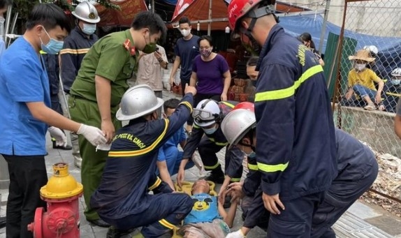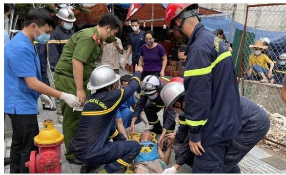 | Lực lượng cứu hộ phá tường đưa nạn nhân ra ngoài |
