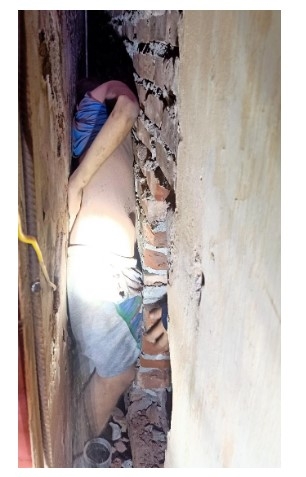 | Cán bộ chiến sĩ Công an quận Bắc Từ Liêm cứu bé trai mắc kẹt giữa 2 khe tường vào tháng 7/2021. |