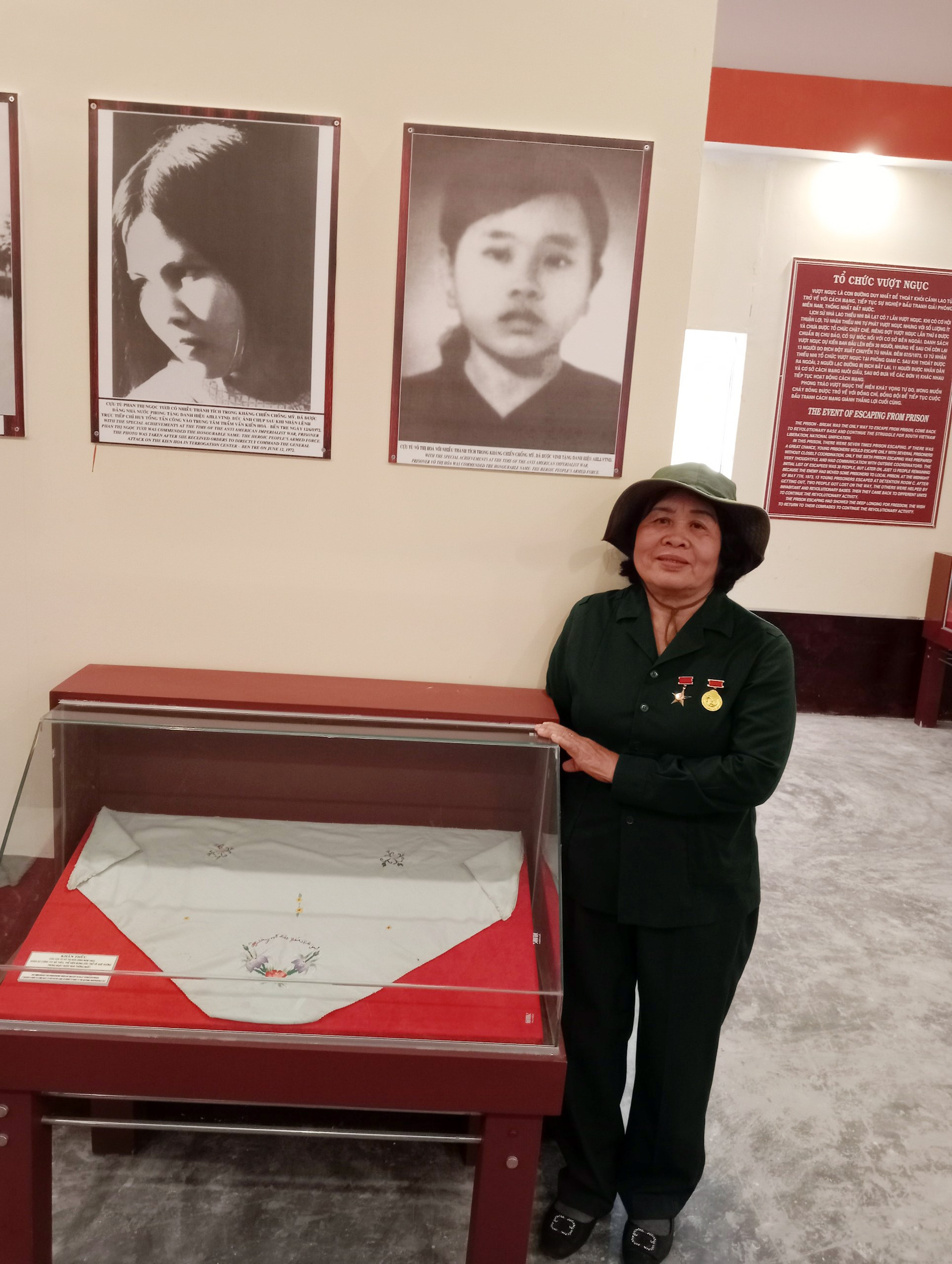 Anh hùng LLVTND Võ Thị Hóa và hiện vật chiếc khăn thêu của bà hiến tặng đang trưng bày tại Nhà lao thiếu nhi Đà Lạt