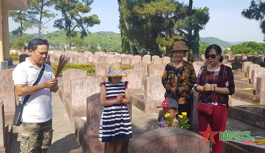 | Thiếu tá Lê Ngọc Hải và người thân bên phần mộ liệt sĩ Lê Văn Hùng. Ảnh nhân vật cung cấp |