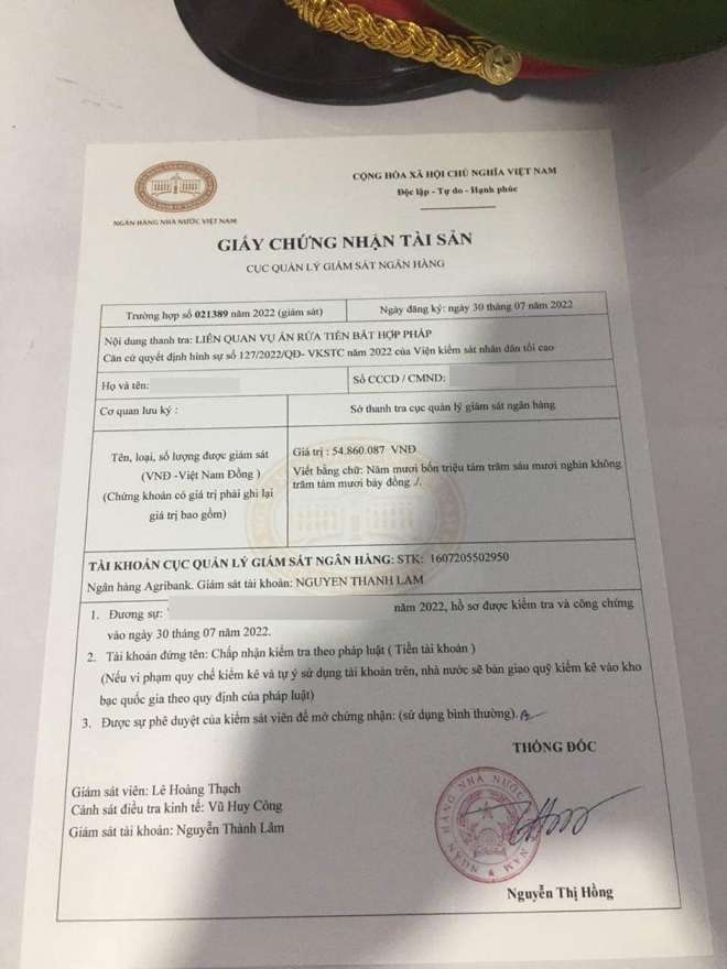 | Giấy chứng nhận tài sản giả mạo sau khi chị T chuyển tiền cho các đối tượng. |