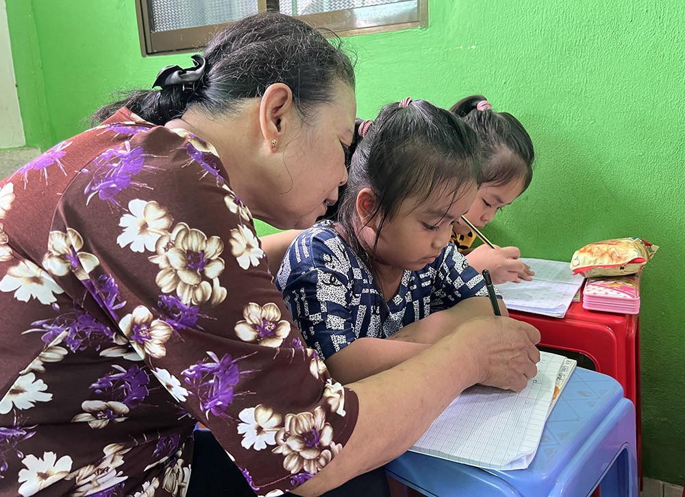 | Cô Mươn dạy đám học trò nhỏ đọc chữ. |