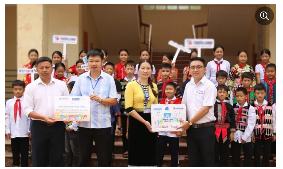 | Đại diện Trung ương Hội LHTN Việt Nam và Tập đoàn Thiên Long trao quà cho thầy, cô giáo và học sinh giáo viên Trường PTDTNT THCS Kỳ Sơn. |