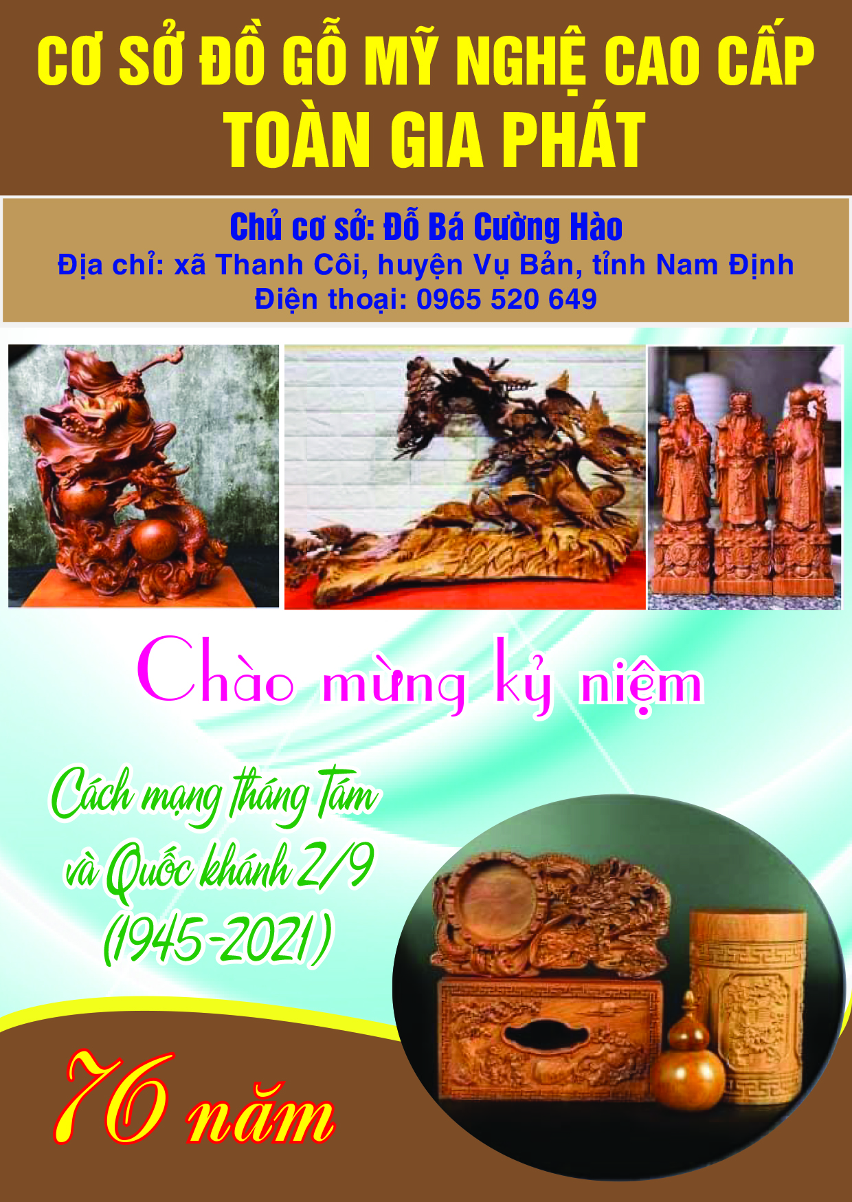 Cơ sở sản xuất đồ gỗ mỹ nghệ Toàn Gia Phát chào mừng kỷ niệm 76 năm Cách mạng Tháng Tám và Quốc khánh 2/9 (1945 - 2021)