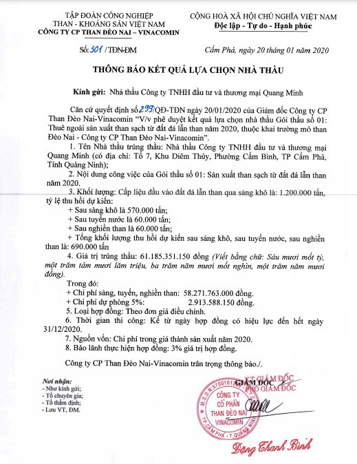 Chẳng hạn tính riêng năm 2022, Công ty Quang Minh đã nhanh chóng "thu hoạch" cho mình gói thầu "khủng" ngay từ giữa tháng 1, đó là gói thầu "thuê ngoài sản xuất than Cám (6+7) từ đất đá lẫn than năm 2022" do Công ty Cổ phần Than Đèo Nai - Vinacomin mời thầu (gọi tắt là Than Đèo Nai). Tuy được tổ chức đấu thầu qua mạng, thế nhưng gói thầu trên không tồn tại bất kỳ sức ép cạnh tranh nào khi Công ty Quang Minh là nhà thầu duy nhất nộp hồ sơ tham dự và nghiễm nhiên trúng thầu.