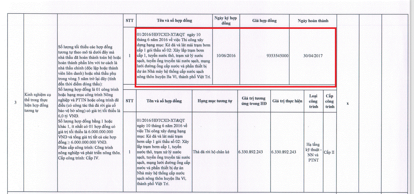Trong phần hợp đồng tương tự Công ty Xuân Thiều đã hợp đồng số 01/2016/HĐTCXD – XT&QT ngày 10/06/2016 về việc thi công xây dựng hạng mục kè đá và lát mài trạm bơm cấp 1 gói thầu số 02 xây lắp trạm bơm cấp 1, tuyến đường thô, trạm xử lý nước sạch, tuyến ống truyền tải nước sạch, mạng lưới đường ống cấp nước và phần thiết bị dự án nhà máy hệ thống cấp nước sạch nông thôn huyện Ba Vì, thành phố Việt Trì. Hợp đồng này được tổ chuyên gia chấm thầu nhận định có hạng mục tương tự là thả đá dời hộ chân kè, với giá trị tương ứng trong hợp đồng bằng 6.330.892.243 VNĐ.