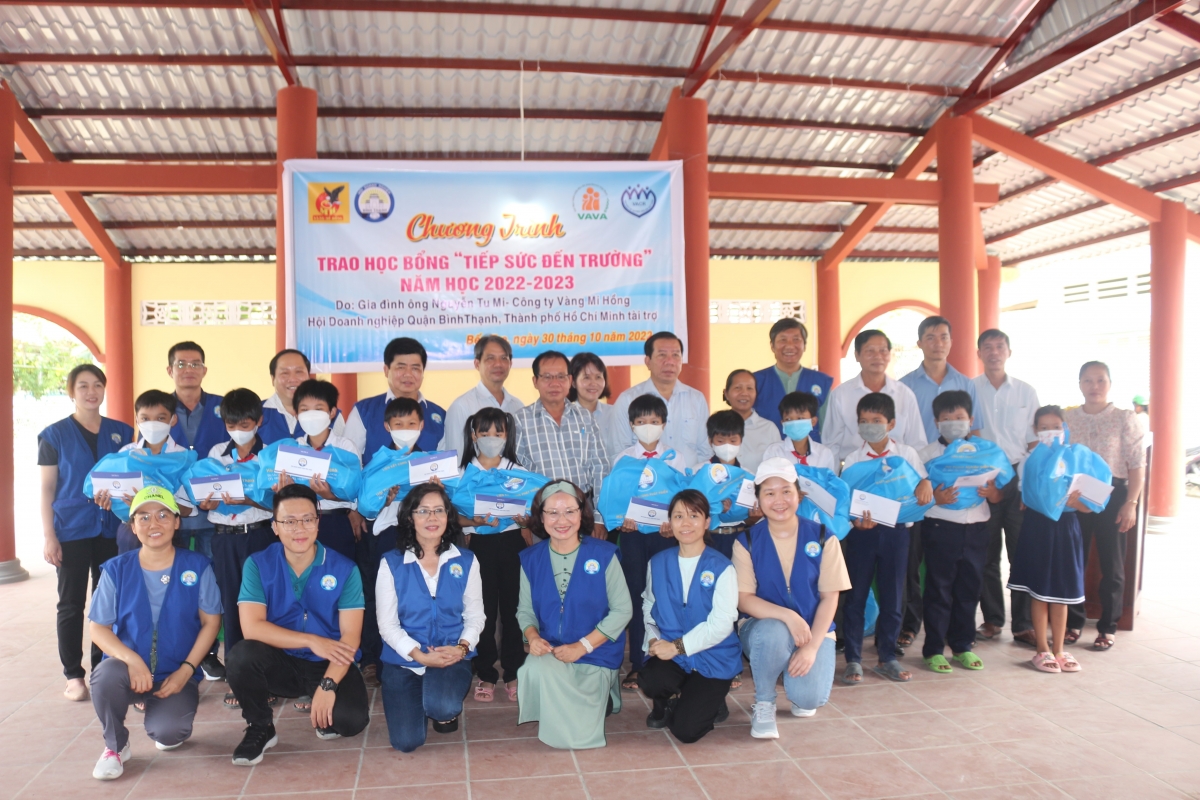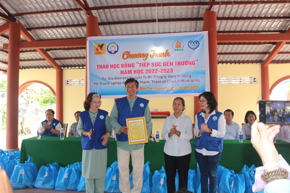 Dự trao học bổng có bà Nguyễn Thị Quỳnh Nga, Phó Giám đốc Sở Công thương tỉnh Bến Tre; bà Trịnh Thị Thanh Bình, Phó Chủ tịch Hội NNCĐDC/dioxin- BVQTE tỉnh Bến Tre; ông Phạm Văn Sang, Phó Bí thư Huyện ủy, Chủ tịch UBND huyện Châu Thành; ông Nguyễn Tu Mi, Chủ tịch Hội Doanh nghiệp quận Bình Thạnh dự.