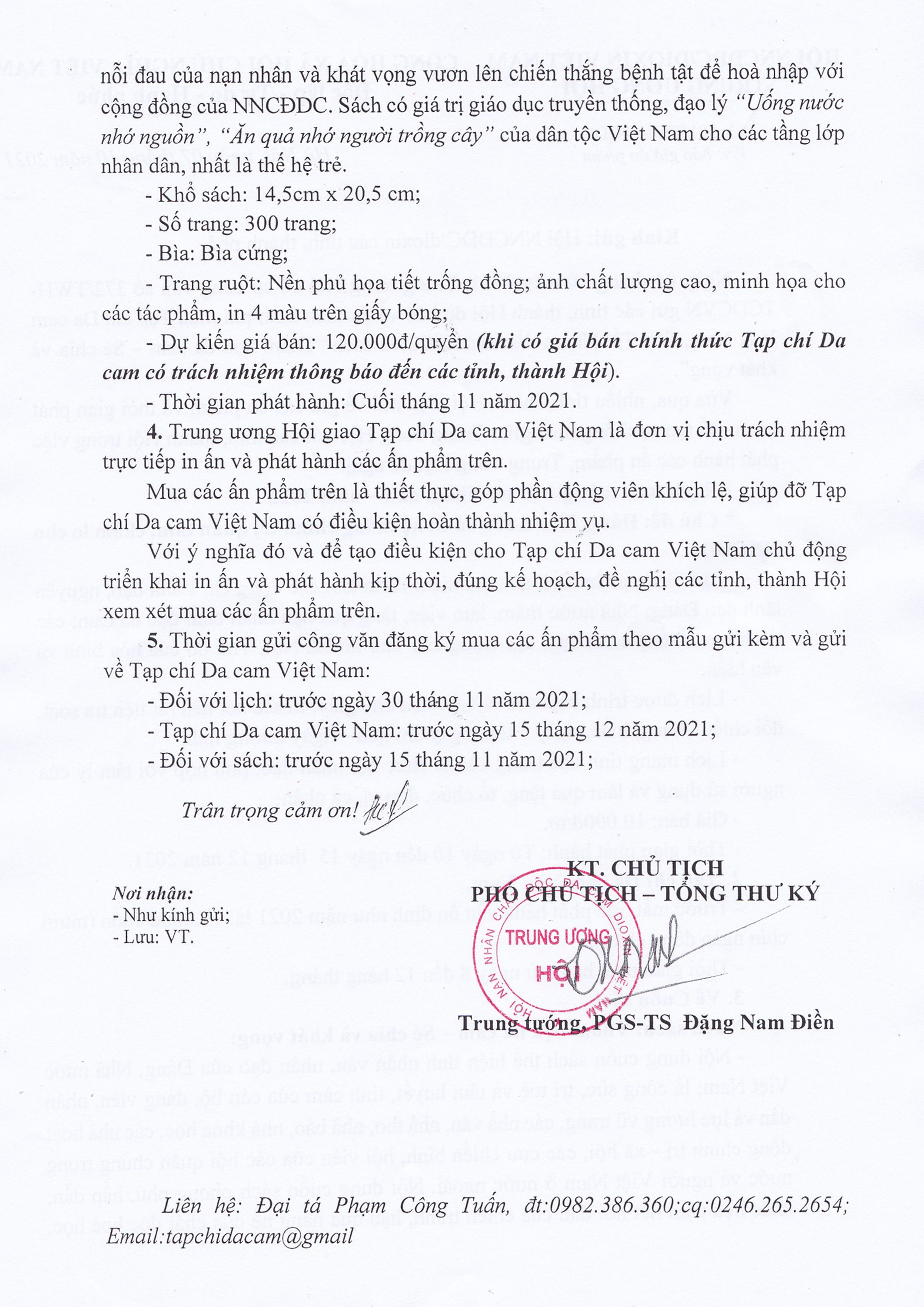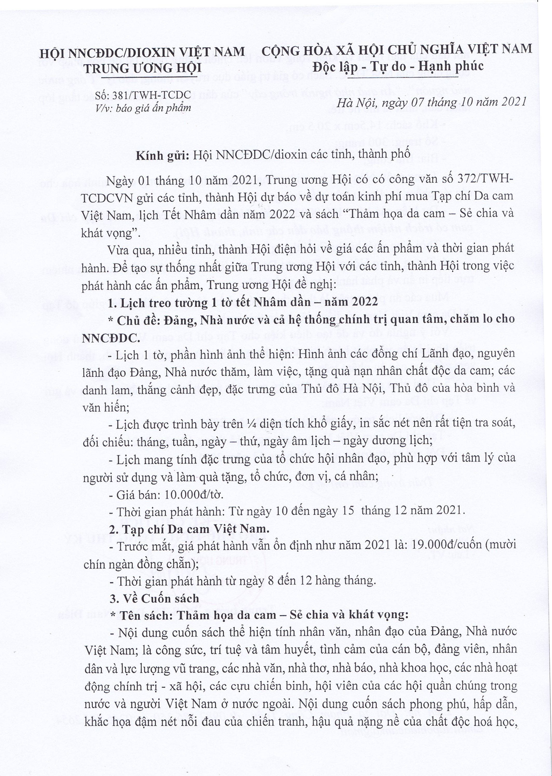 Công văn số 381/TWH-TCDC về việc báo giá ấn phẩm: Lịch năm 2022, Tạp chí Da cam Việt Nam, Sách Thảm họa da cam - sẻ chia và khát vọng