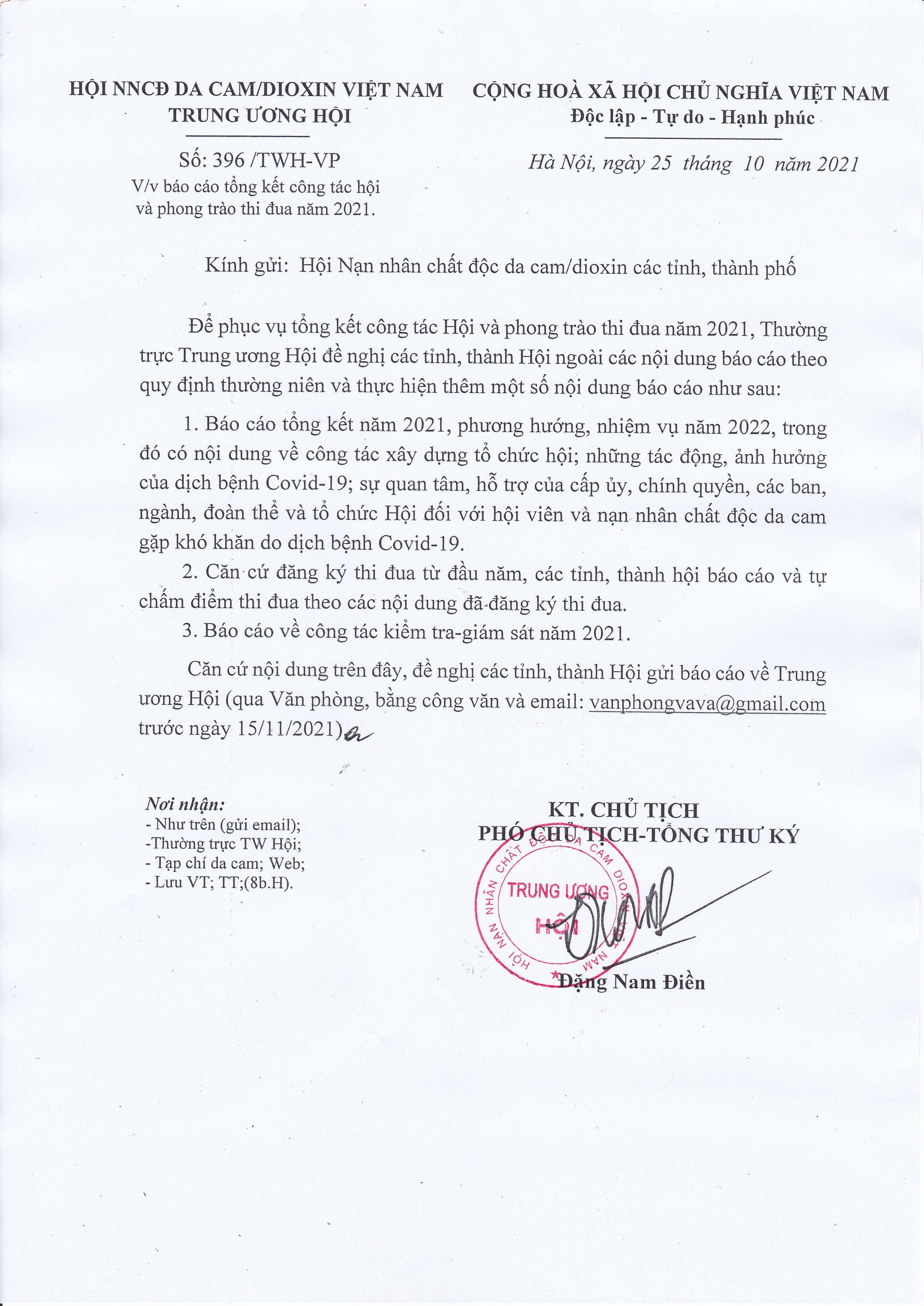 Công văn số 396/TWH-VP về việc báo cáo tổng kết công tác Hội và phong trào thi đua năm 2021