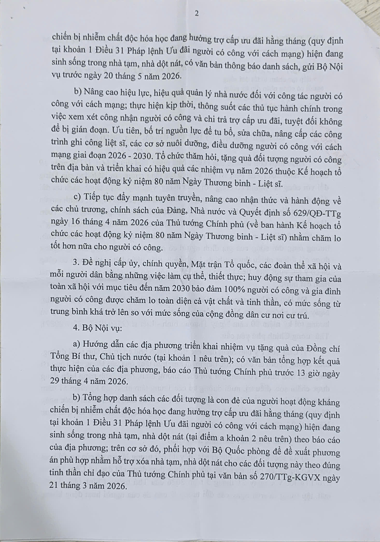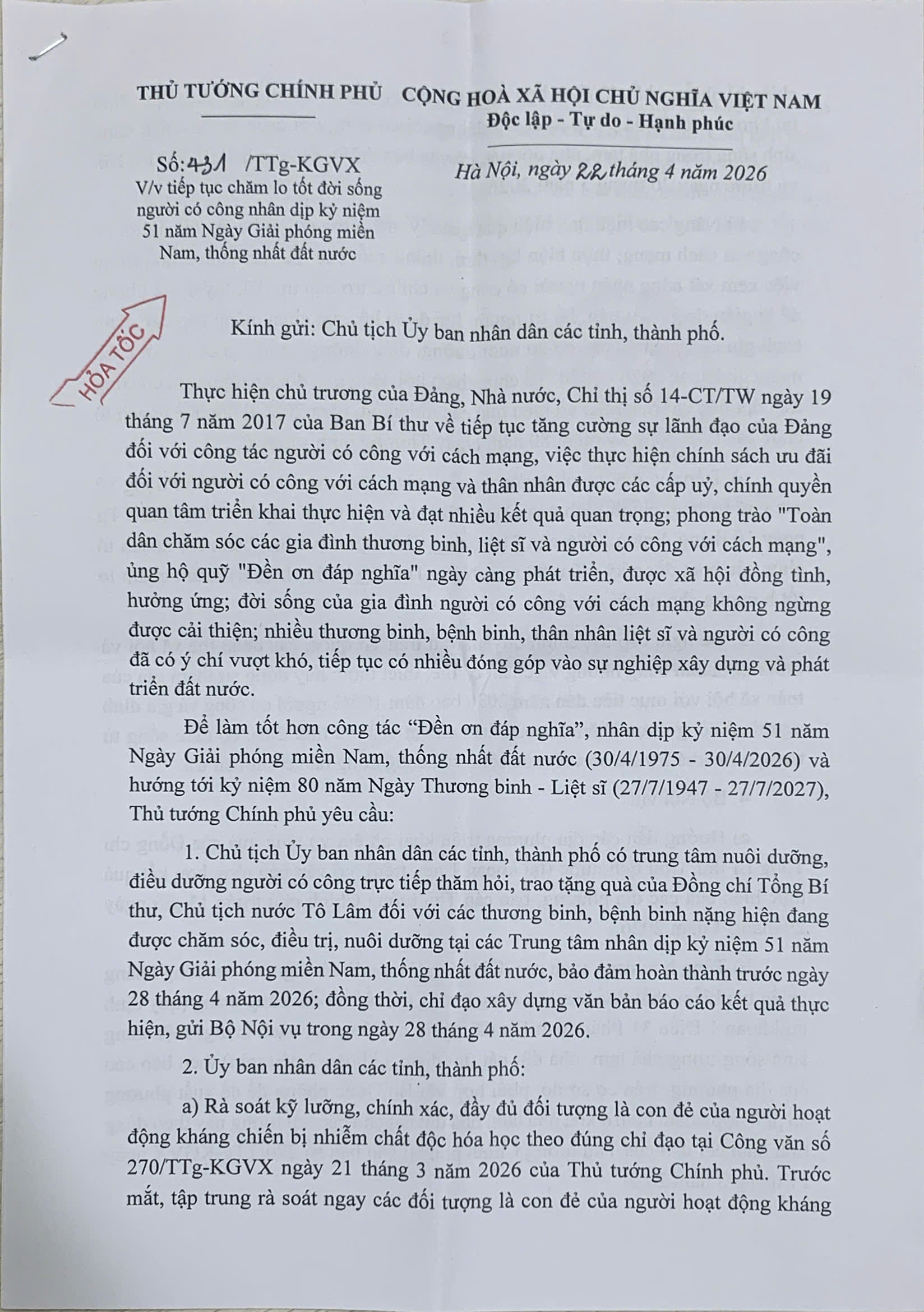 Để làm tốt hơn công tác “Đền ơn đáp nghĩa”, Thủ tướng Chính phủ ban hành Công văn số 431/TTg-KGVX ngày 22/4/2026 về việc tiếp tục chăm lo tốt đời sống người có công nhân dịp kỷ niệm 51 năm Ngày Giải phóng miền Nam, thống nhất đất nước. Tạp chí điện tử Da cam Việt Nam trân trọng đăng toàn văn Công văn số 431/TTg-KGVX ngày 22/4/2026.