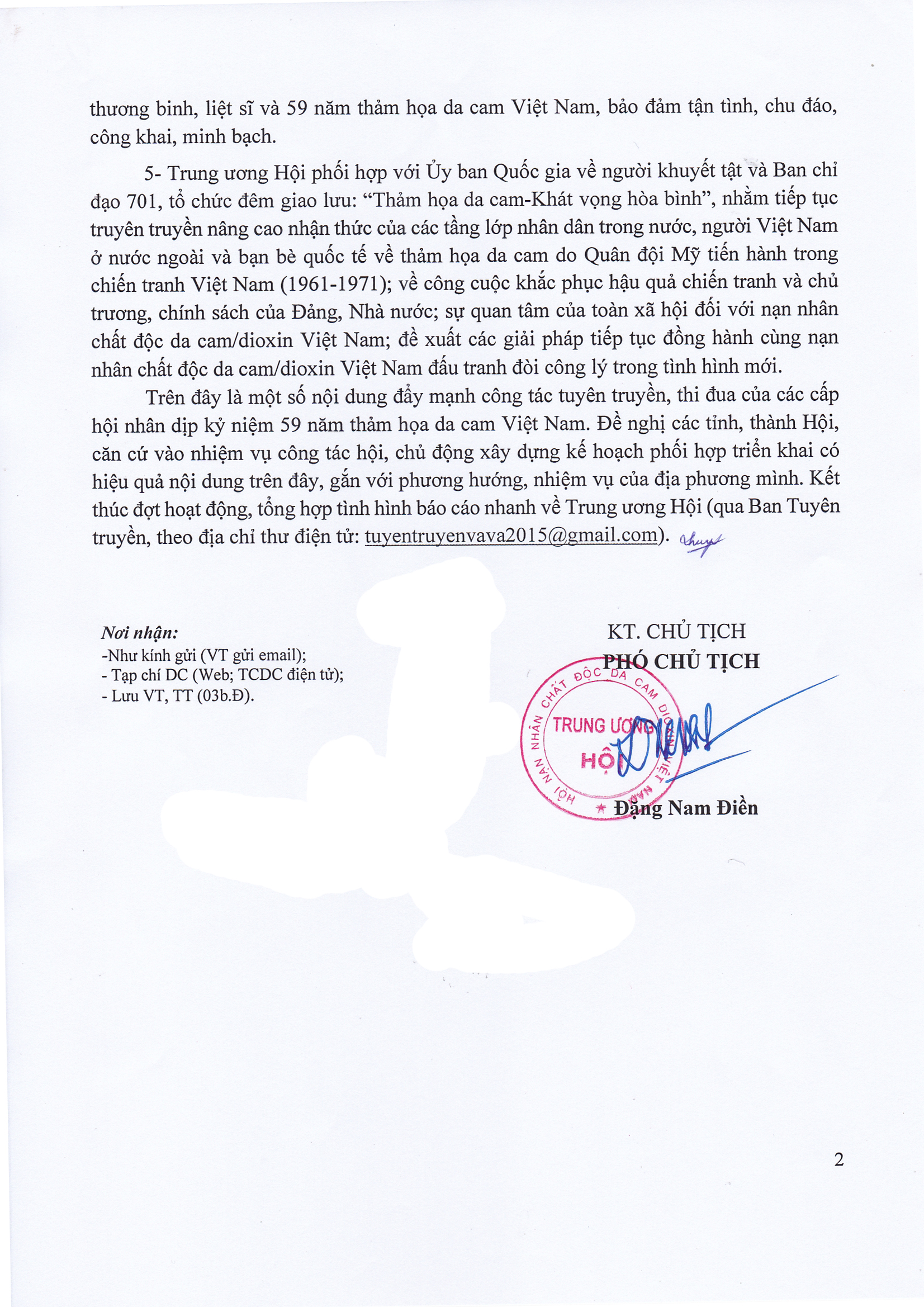 Công văn số:174/TWH-TT, v/v đẩy mạnh hoạt động tuyên truyền, thi đua nhân dịp kỷ niệm 59 năm thảm họa da cam Việt Nam