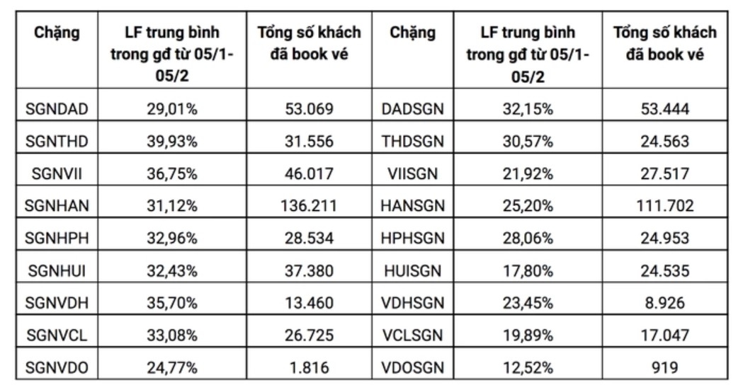 Đối với một số đường bay trong một số ngày cao điểm như: Chặng bay TP HCM - Đà Nẵng tỉ lệ đặt chỗ cao nhất là 70,9% vào ngày 18-1-2023; chặng bay Đà Nẵng - TP HCM tỉ lệ đặt chỗ cao nhất là 89% vào ngày 28-1-2023; chặng bay TP HCM - Hải Phòng tỉ lệ đặt chỗ cao nhất là từ 87-88% vào các ngày 17 và 18-1-2023; chặng bay Hải Phòng - TP HCM tỉ lệ đặt chỗ cao nhất là 92% vào ngày 29-1-2023 và 86%-87% vào các ngày 27 và 28-1-2023; chặng bay TP HCM - Thanh Hoá tỉ lệ đặt chỗ cao nhất là từ 84-86% vào các ngày 17 đến 19-1-2023; chặng bay Thanh Hoá - TP HCM tỉ lệ đặt chỗ cao nhất là từ 82-85% vào các ngày 27, 29-1-2023; chặng bay TP HCM - TP Vinh tỉ lệ đặt chỗ cao nhất là từ 84-86% vào các ngày 17 đến 19-1-2023; chặng bay Vinh - TP HCM tỉ lệ đặt chỗ cao nhất là từ 80-82% vào các ngày 27 đến 29-1-2023; chặng bay TP HCM - Hà Nội tỉ lệ đặt chỗ cao nhất là 59% vào ngày 18-1-2023; chặng bay Hà Nội - HCM tỉ lệ đặt chỗ cao nhất là 79% vào ngày 29-1-2023.