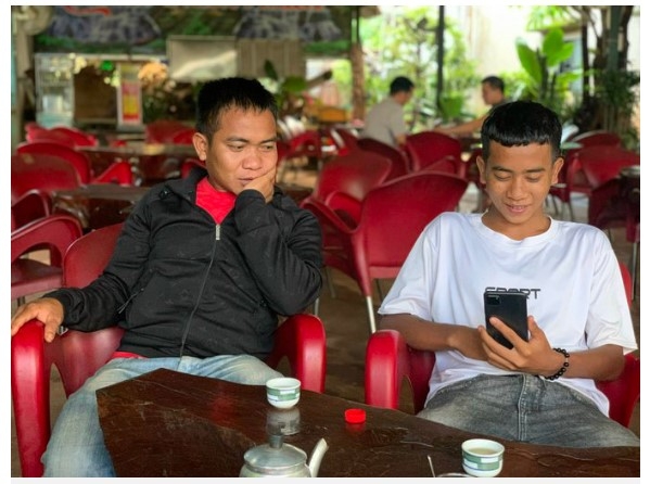 | Puih Thái (áo đen) và Puih Phú (áo trắng) may mắn vừa thoát khỏi "địa ngục" bên Campuchia trở về Việt Nam |