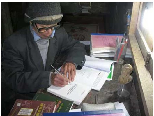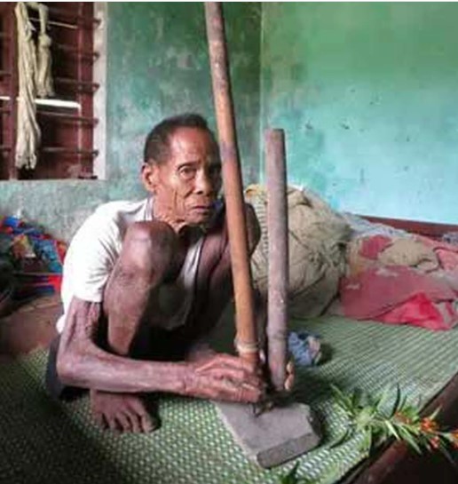 Chúng tôi tìm gặp ông Cao Ống, thầy mo nổi tiếng của cả xứ người Rục tại đây. Người thầy mo gầy gò, lưng còng hẳn xuống không nhớ tuổi và được gọi là Cao Ống bởi nó gắn liền với "y thuật" của người Rục.