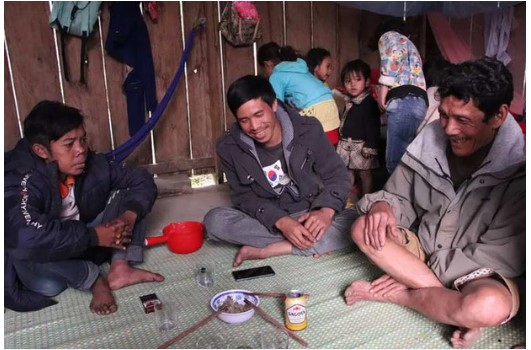 Lần theo con đường bê tông sạch thoáng, trong một nếp nhà khác được bao bọc xung quanh bởi vải bạt. Dưới chái bếp lợp dở, có 4 người đàn ông đang nhậu. Anh Đinh Văn Bắc (sinh năm 1988) được nghỉ phép về quê. Anh là một trong số rất ít những người Chứt dám vượt núi để xuống xuôi đi làm. Anh cũng được coi là người có thu nhập cao nhất ở bản. Anh làm công nhân bảo trì đường tàu ở Đồng Hới. Trừ tiền ăn nghỉ, anh còn dư khoảng 3 triệu/tháng. Số đó được chia đều cho phần sinh hoạt của gần 10 thành viên trong gia đình. Cơm gạo thì đã có Nhà nước lo, cuộc sống thế cũng coi là khấm khá trong bản.