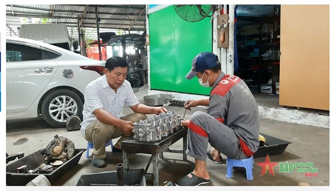 | Cựu chiến binh Trần Nhật Ninh (bên trái) hướng dẫn học viên thực hành sửa chữa ô tô. |