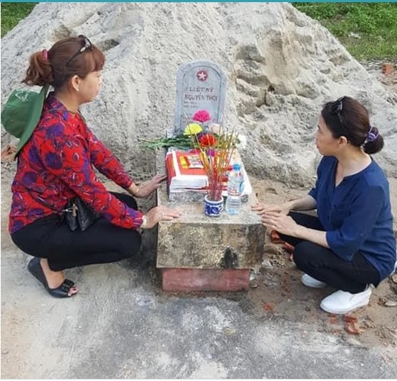 | Bà Vũ Thị Hải, vợ cựu chiến binh Nguyễn Văn Khánh (bên phải) và bà Nguyễn Thị Lan, em gái ông Khánh, bên mộ liệt sĩ Nguyễn Văn Thơi (bia mộ ghi là Nguyễn Thới) |