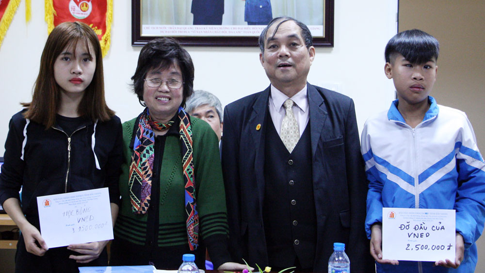 Bà Tạ Thị Thinh (thứ 2) đại diện Hội Bảo vệ trẻ em Việt Nam nhiễm dioxin Cộng hòa Pháp (VNED) tổ chức trao học bổng đỡ đầu (6 tháng cuối năm 2017) cho 13 trẻ em bị phơi nhiễm chất độc hóa học