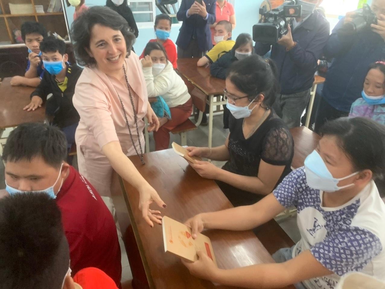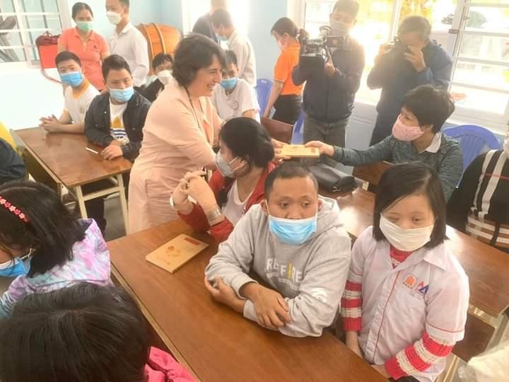 Bà Đại sứ làm việc tại Trung tâm Bảo trợ nạn nhân chất độc da cam và trẻ em bất hạnh thành phố Đà Nẵn (tại thôn Phước Hưng, xã Hòa Nhơn, huyện Hòa Vang)