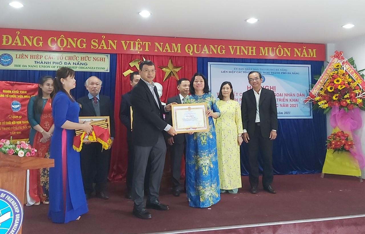 . Dịp này, hội nghị cũng công bố các quyết định khen thưởng và trao tặng cờ thi đua, bằng khen của bằng khen của Ban Tuyên giáo Trung ương, Liên hiệp các tổ chức Hữu nghị Việt Nam, Bằng khen của UBND thành phố Đà Nẵng và giấy khen của Chủ tịch Liên hiệp các tổ chức Hữu nghị thành phố Đà Nẵng năm 2020 cho các tập thể và cá nhân.