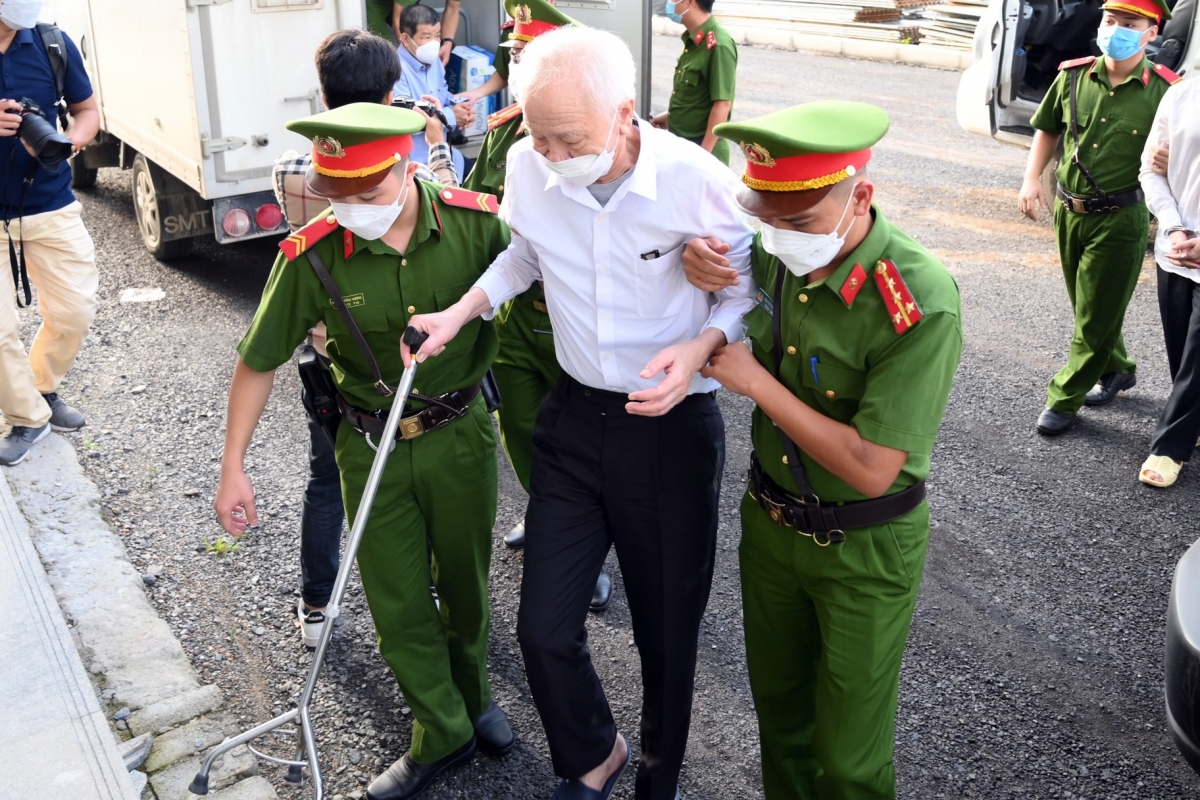 Trước khi xét xử, ông Minh chống gậy và được 2 cảnh sát dìu từ xe đặc chủng vào phòng xử án ở tầng 3 trụ sở TAND Hà Nội. Khi trả lời, bị cáo được ngồi ghế để khai báo.