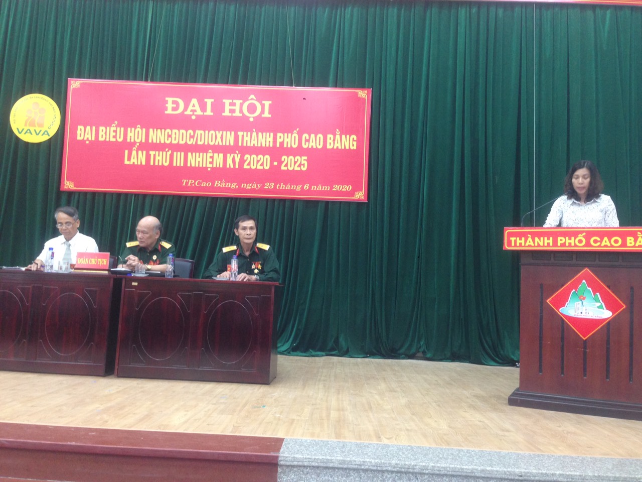 Ngày 23/6/2020, tại Hội trường UBND thành phố đã tổ chức Đại hội đại biểu Hội NNCĐDC/dioxin thành phố Cao Bằng, lần thứ III, nhiệm kỳ 2019-2024. Đến dự Đại hội có: ông Nông Đức Thắng, Uỷ viên Hội NNCĐDC/dioxin Việt Nam, Chủ tịch Hội NNCĐDC/dioxin tỉnh Cao Bằng, bà Nguyễn Thị Huệ Chi, Phó Chủ tịch UBND thành phố, ông Vũ Văn Minh, UVBTV, Trưởng ban Dân vận thành phố, Chủ tịch UBMTTQVN thành phố, các cán bộ đại diện lãnh đạo HĐND, các ban, ngành, đoàn thể, các cơ quan của thành phố, các cán bộ Thường trực Tỉnh hội và 60 đại biểu đại diện cho 487 hội viên, thuộc 11 Hội cấp xã, phường của thành phố.
