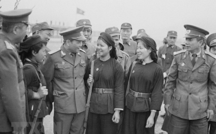 | Đại tướng Chu Huy Mân, Chủ nhiệm Tổng cục Chính trị nói chuyện với các nữ dân quân dân tộc Tày ở Lạng Sơn (1984) - Ảnh tư liệu TTXVN |