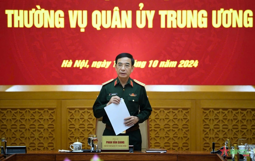 Đại tướng Phan Văn Giang, Ủy viên Bộ Chính trị, Phó bí thư Quân ủy Trung ương, Bộ trưởng Bộ Quốc phòng phát biểu tại hội nghị.