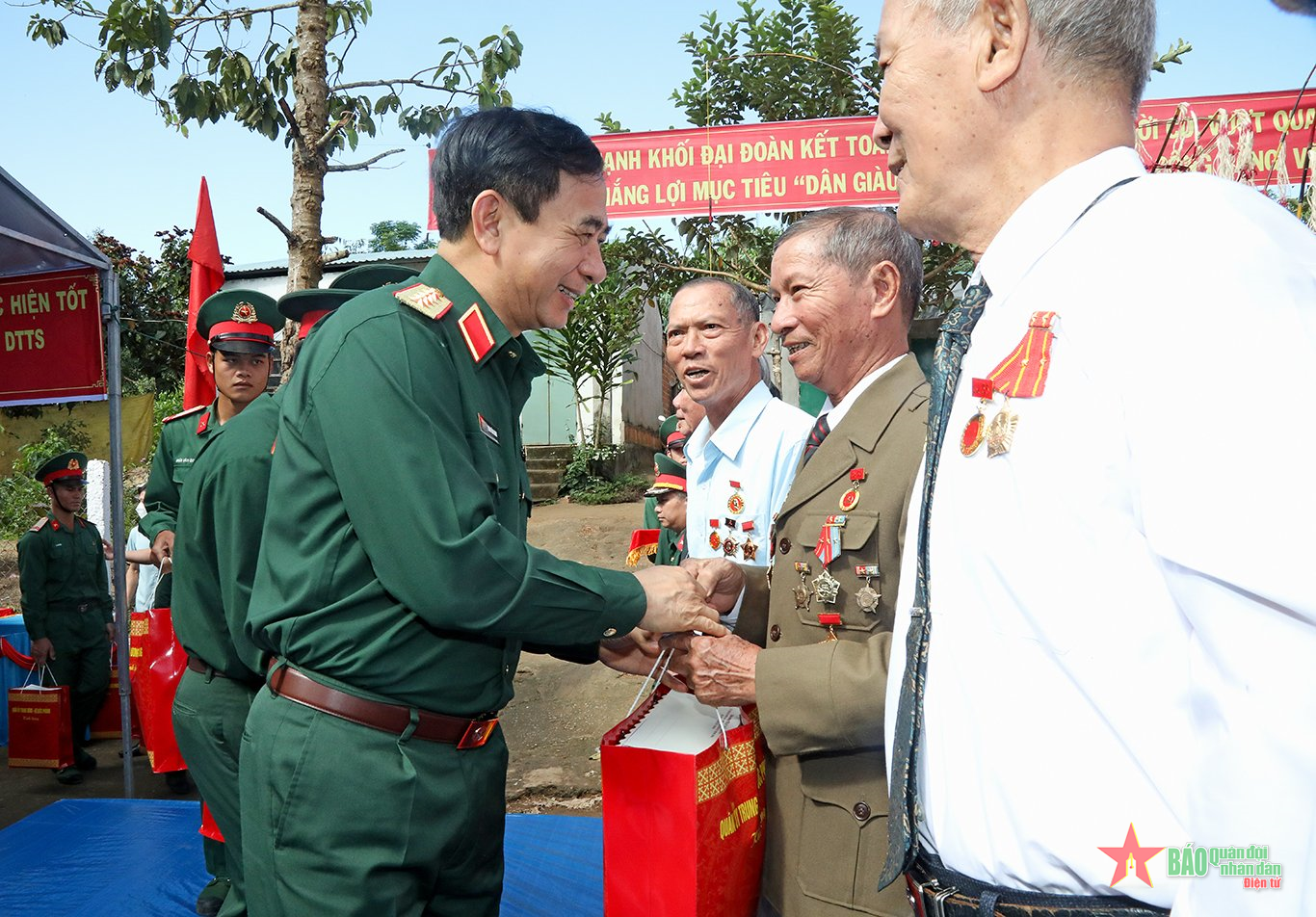| Đại tướng Phan Văn Giang và Thiếu tướng Nguyễn Văn Gấu tặng quà bà con thôn Đăk Tiêng Kơ Tu. |
