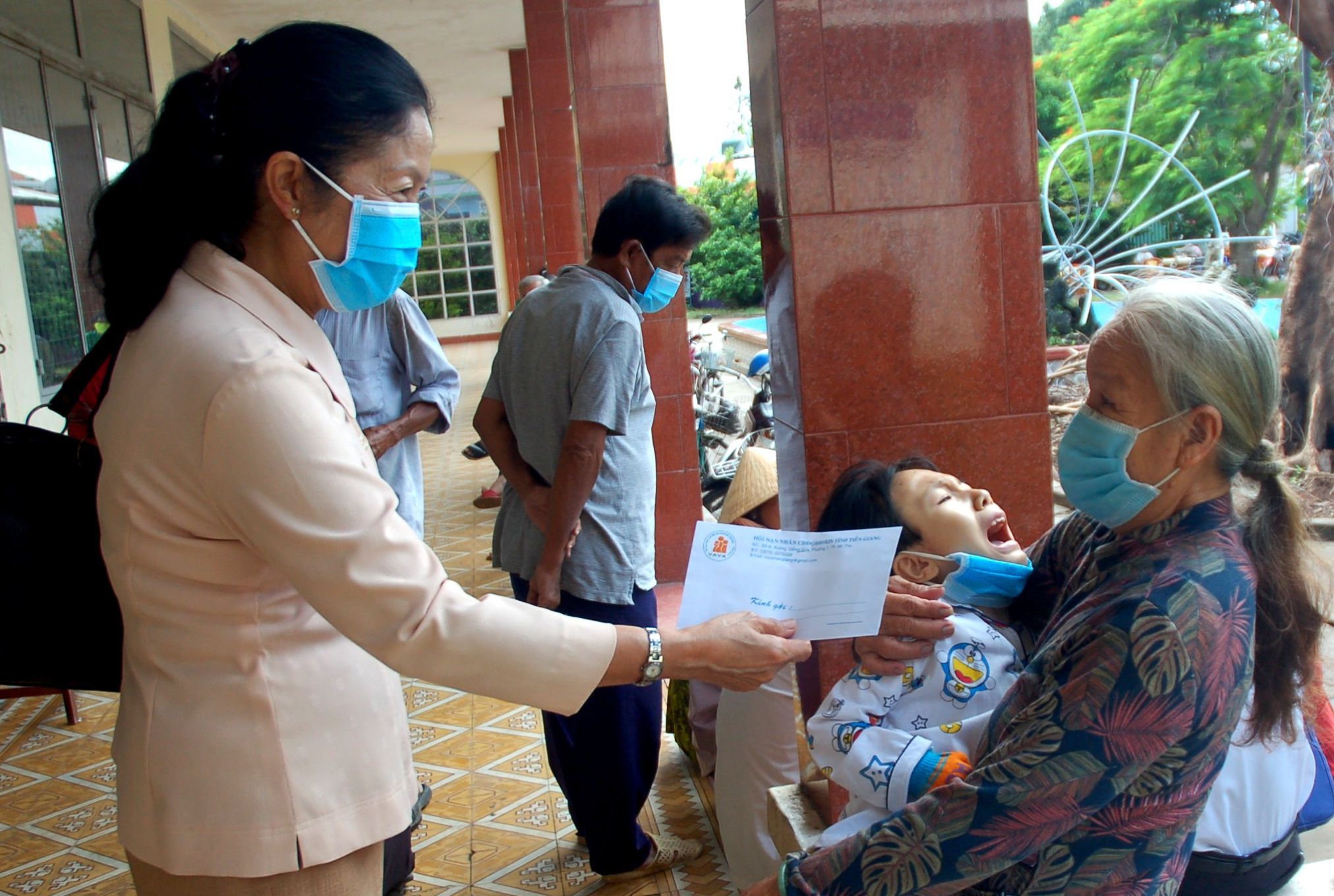 Bà Dương Thị Lệ, Chủ tịch Hội NNCĐDC/dioxin tỉnh Tiền Giang thăm hỏi và tặng quà cho nạn nhân ở thị trấn Tân Hiệp, huyện Châu Thành