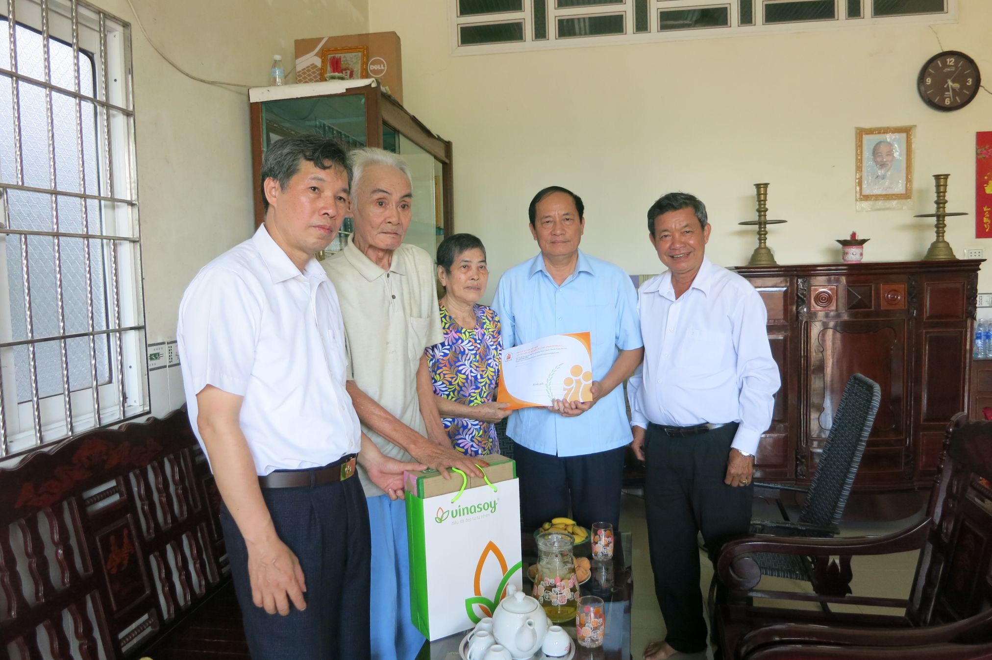Trung tướng PGS,TS Đặng Nan Điền, Phó chủ tịch Hội NNCĐDC/dioxin Việt Nam tặng quà cho gia đình nạn nhân Đặng Thị Kim Hồng ở thành phố Vị Thủy