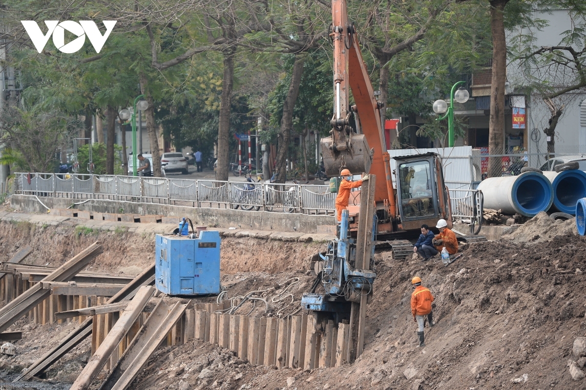Hệ thống thu gom nước thải dọc 2 bên sông Tô Lịch đang được thi công.