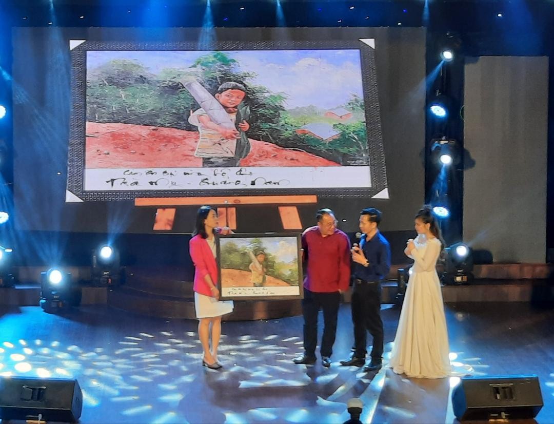 Bức tranh cậu bé Hồ Ánh Khiết tại Nam Trà My (Quảng Nam) đi chân trần vác măng rừng ủng hộ người dân Đà Nẵng trong chống dịch COVID-19 được vẽ lại bằng chất liệu sơn dầu để BTC bán đấu gía ủng hộ chương tình