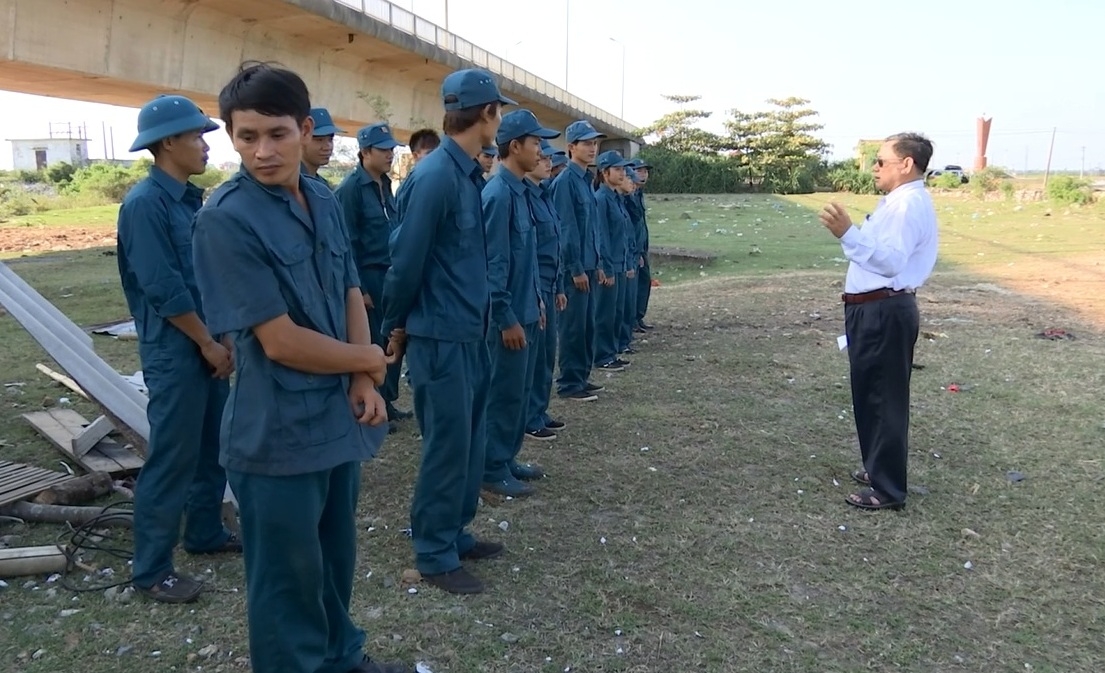| Ông Trần Đình Lập kể chuyện truyền thống cùng dân quân trẻ phường Quảng Thuận bên bến phà Gianh II |