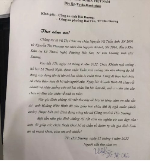 "Gia đình chúng tôi viết thư này để bày tỏ lòng cảm ơn sâu sắc tới anh Hoàng Hữu Bình đã cứu giúp hai cháu khi bị đuối nước... Một lần nữa, gia đình chúng tôi cảm ơn nghĩa cử cao đẹp của anh đã giúp các cháu thoát khỏi hố tử thần về đoàn tụ với gia đình bình an và mạnh khỏe.", thư cảm ơn của 2 người mẹ, viết.
