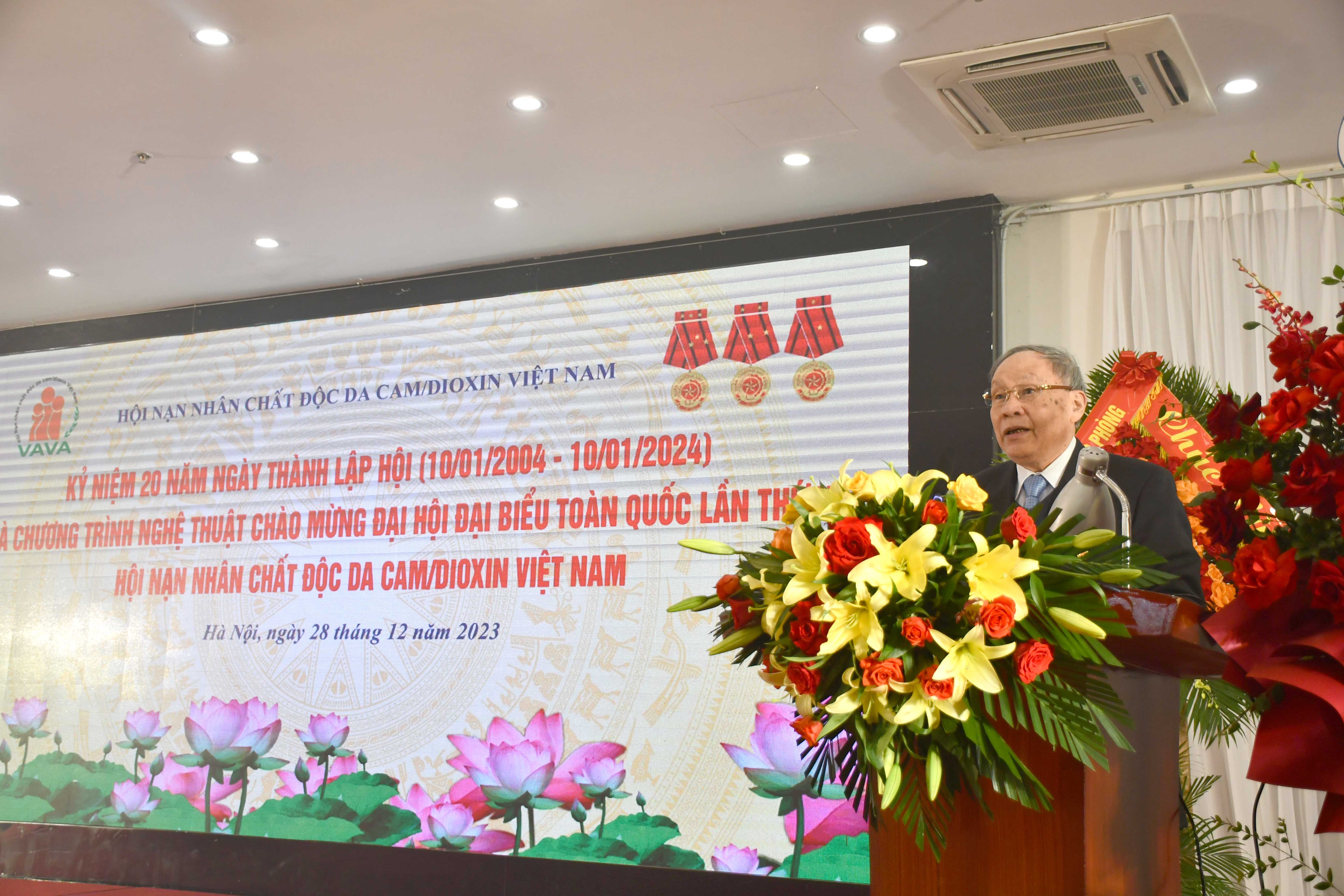 Hôm nay, Hội Nạn nhân chất độc da cam (NNCĐDC)/dioxin Việt Nam tổ chức kỷ niệm 20 năm ngày thành lập Hội (10/01/2004-10/01/2024), cũng đúng vào dịp Hội tổ chức Đại hội đại biểu toàn quốc lần thứ V, nhiệm kỳ 2023-2028. Thay mặt BCH Trung ương Hội, tôi nhiệt liệt chúc mừng các Quý vị đại biểu, khách quý và các đại biểu về dự Đại hội lần thứ V và kỷ niệm 20 năm thành lập Hội. Chúc các đồng chí mạnh khỏe, hạnh phúc và thành công!