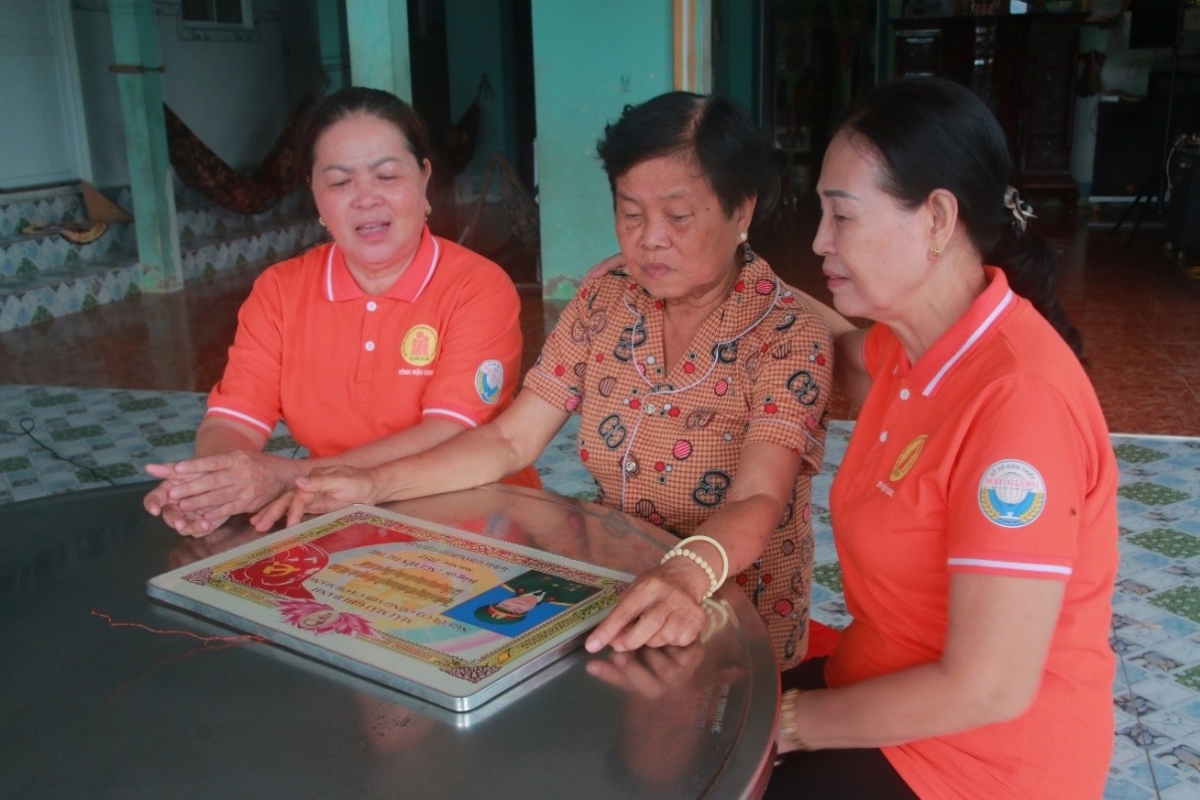 | Bà Thu (người ngồi giữa) chia sẻ những câu chuyện thời chiến cho các nữ cán bộ Hội Nạn nhân Chất độc da cam – Bảo trợ Người tàn tật – Trẻ em mồ côi huyện Vị Thuỷ. |