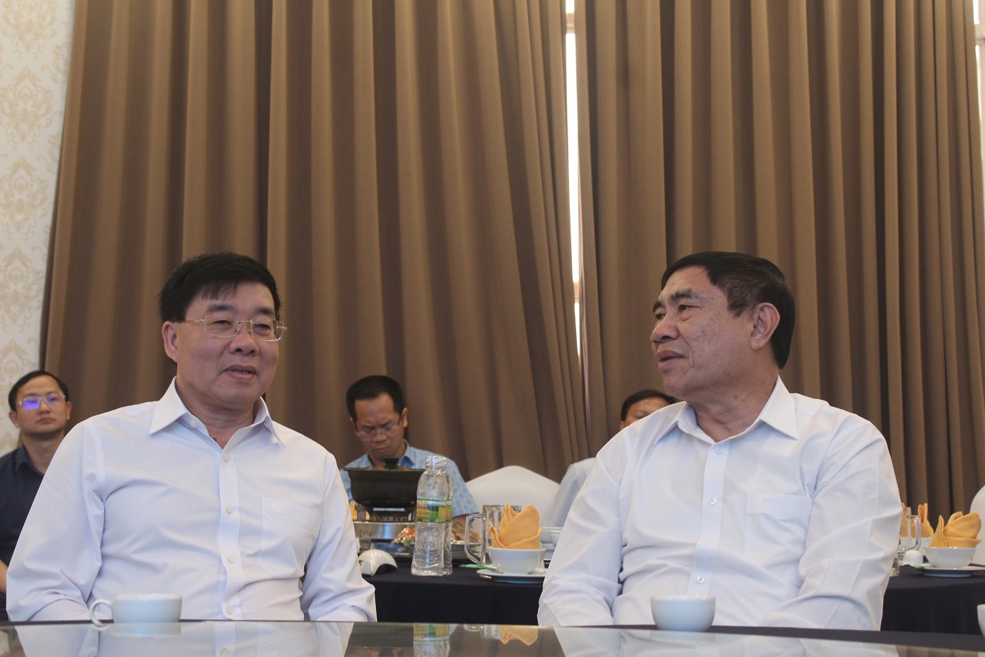 Phó Bí thư Thường trực Tỉnh ủy Nghệ An Nguyễn Văn Thông (bên trái) trao đổi cùng Bí thư Tỉnh ủy Điện Biên Trần Quốc Cường