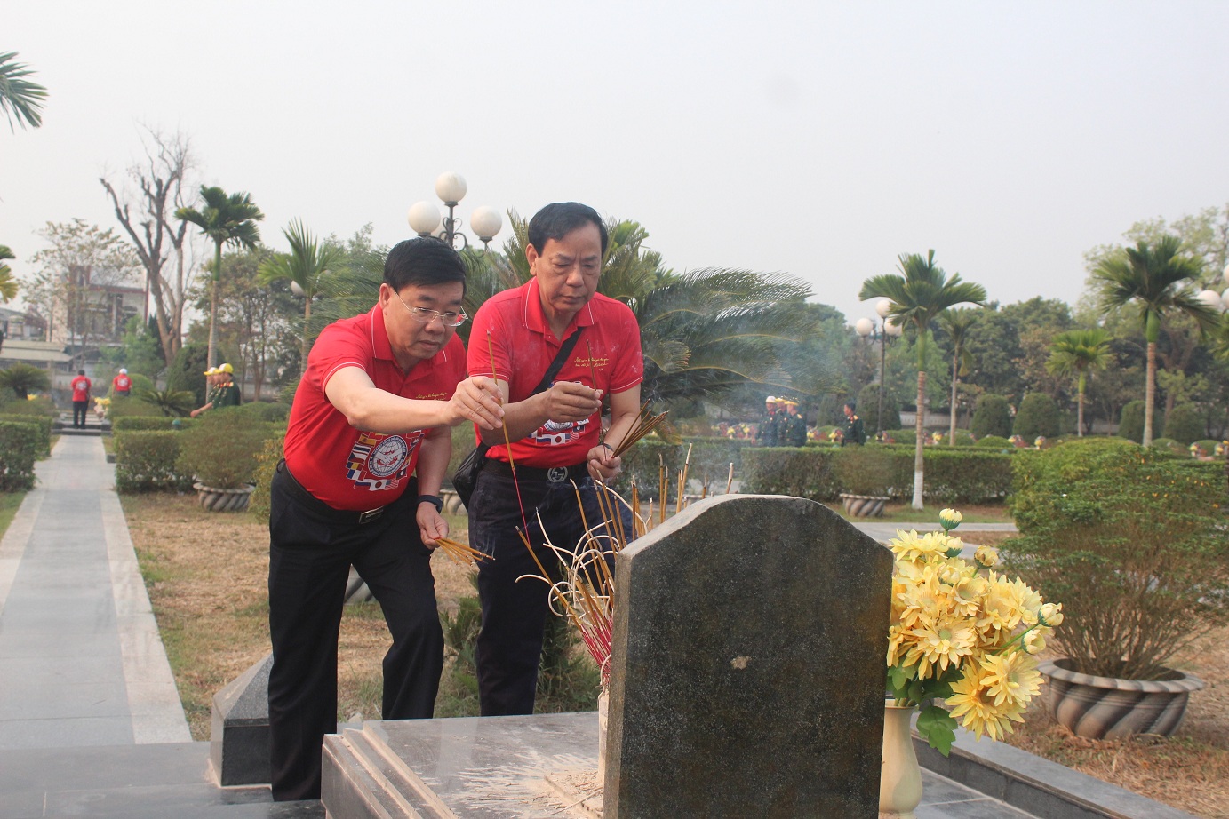 Đồng chí Nguyễn Văn Thông - Phó Bí thư Tỉnh ủy và đồng chí Nguyễn Hồng Kỳ, Phó Chủ tịch Liên hiệp hữu nghị Nghệ An thắp hương tại các phần mộ liệt sĩ