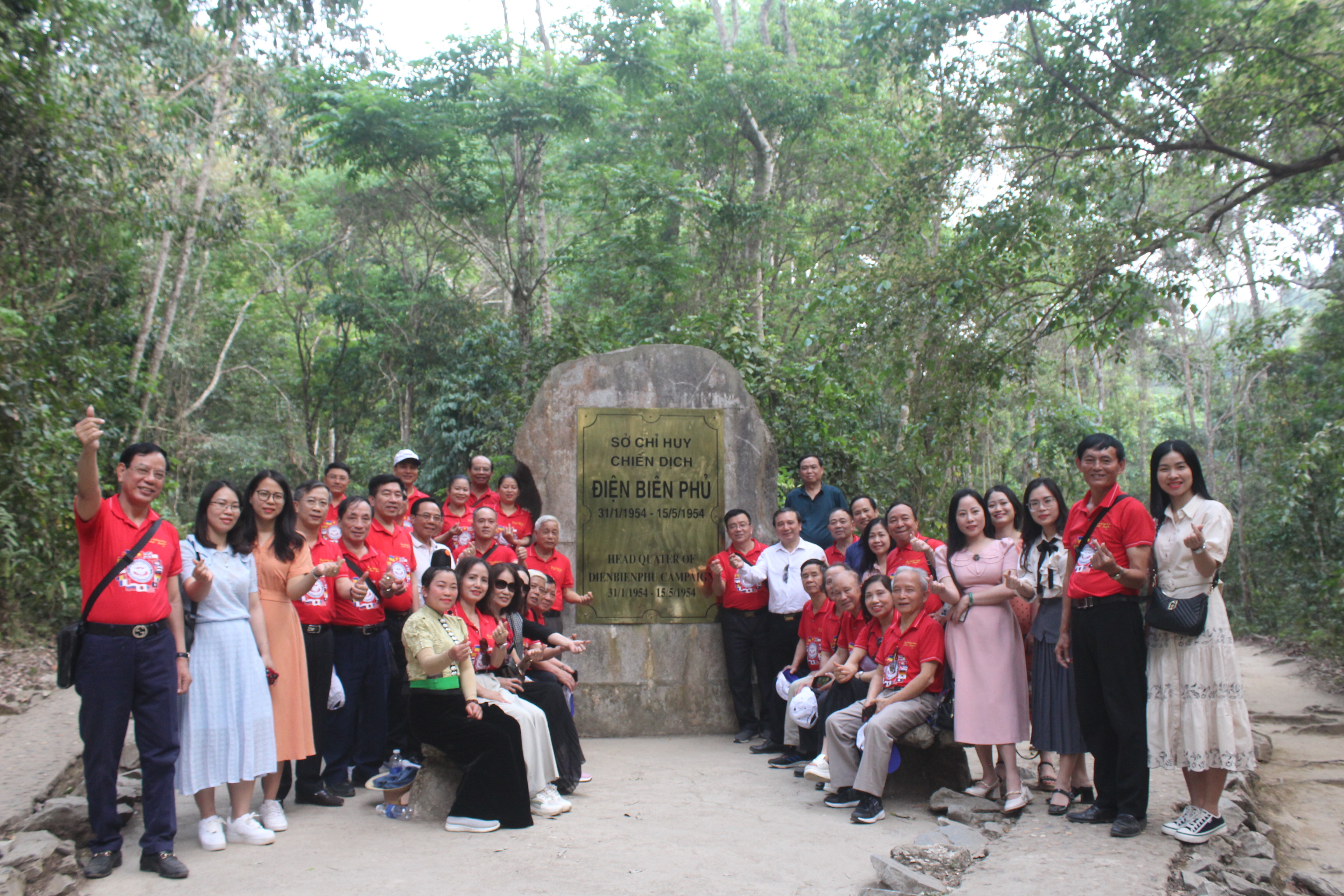 Đoàn công tác chụp ảnh lưu niệm tại Sở chỉ huy chiến dịch Điện Biên Phủ ở Mường Phăng