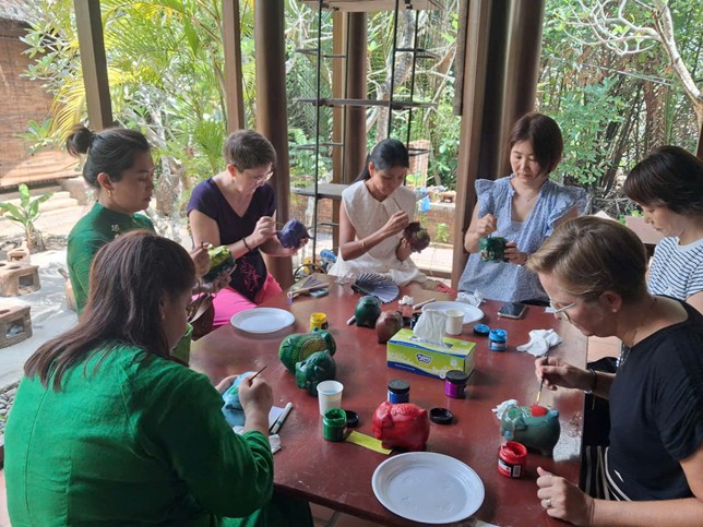 Điểm nhấn của chương trình là hoạt động “cùng nhau hát và vẽ heo đất”. Các thành viên Đoàn Hội Phụ nữ Quốc tế đã trực tiếp tham gia trang trí những chú heo đất cùng các nạn nhân. Từng nét vẽ rực rỡ, sinh động không chỉ thể hiện sự sáng tạo mà còn gửi gắm thông điệp về tình đoàn kết, sẻ chia và niềm tin vào một tương lai tươi sáng.