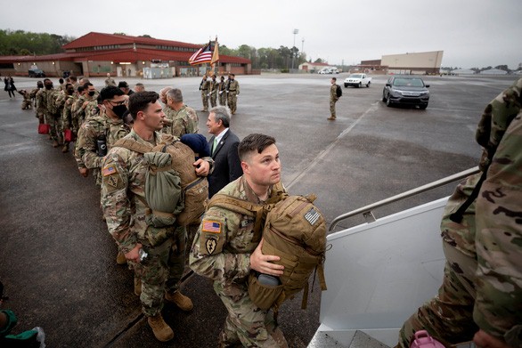 Các binh sĩ Mỹ lên máy bay vận tải đến châu Âu ngày 11-3 trong bối cảnh chiến sự ở Ukraine chưa có dấu hiệu hạ nhiệt