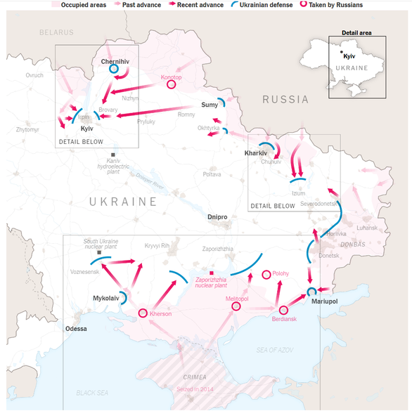 Tình hình Ukraine ngày 11-3 với mũi tên màu đỏ là các hướng tấn công của Nga, những vòng cung màu xanh là nơi Ukraine tổ chức phòng thủ