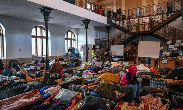 Những người chạy trốn khỏi cuộc chiến ở Ukraine nghỉ ngơi trong một ga tàu hỏa cũ tại Ba Lan ngày 11-3