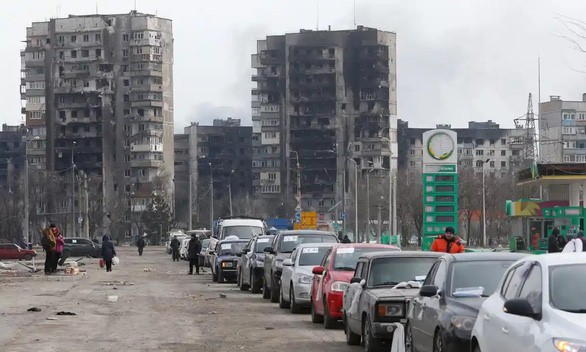 Các chung cư bị hư hại và dòng xe xếp hàng để sơ tán tại thành phố Mariupol, Ukraine ngày 17-3