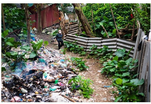 Để xuống nhà hai vợ chồng bác Nguyễn Hải Ly (73 tuổi) và bác Nguyễn Trung Quang (70 tuổi), phải băng qua một con đường đầy rác thải, phế liệu mà dân cư xung quanh xả ra. Ở mép sông có thể thấy nhung nhúc loăng quăng, bọ gậy; Tiếng muỗi vo ve có thể nghe thấy từ cách xa nhiều mét.