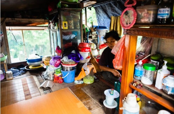 "Căn nhà" được chia làm ba gian: Đuôi thuyền để ngủ, giữa thuyền là không gian sinh hoạt chung và đầu thuyền là bếp. Nói là gian nhưng thực ra mỗi khu chỉ đủ chỗ cho một người lớn ngồi, trần mái thuyền cũng khá thấp, không đủ để họ đứng thẳng người.