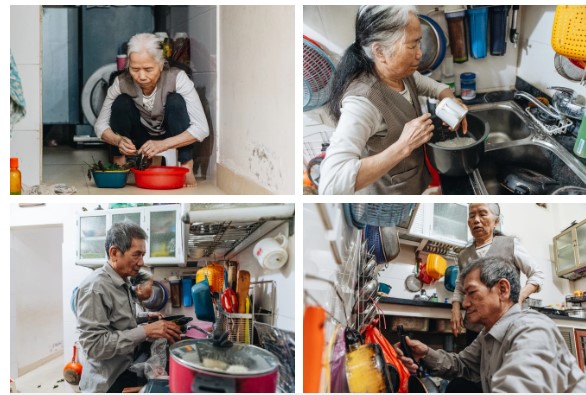 Ông bà phụ giúp con cái nấu cơm, ngắt rau,...