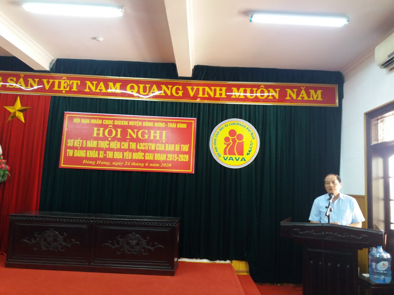 Ngày 25/6, Huyện ủy, UBND, Hội NNCĐDC/dioxin huyện Đông Hưng (Thái Bình) đã tổ chức Hội nghị Sơ kết 5 năm thực hiện Chỉ thị 43-CT/TW của Ban Bí thư Trung ương Đảng (khóa XI). Hội nghị đã đánh giá những thành tựu đạt được chỉ ra những tồn tại cần khắc phục trong thực hiện Chỉ thị 43-CT/TW trên địa bàn huyện Đông Hưng!