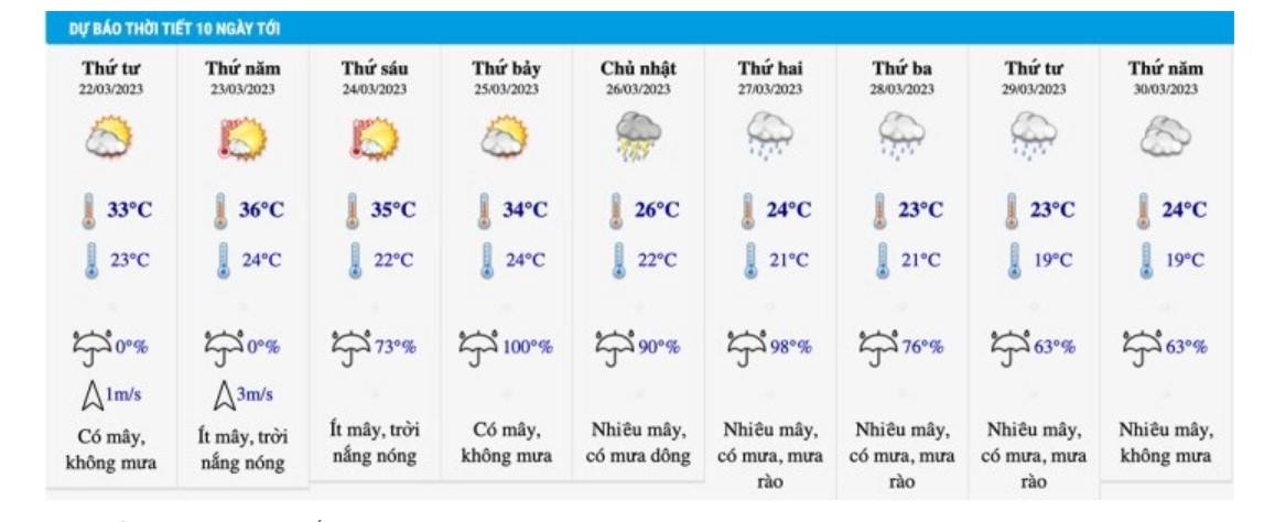 Theo bảng dự báo thời tiết 10 ngày tới, ngày 23/3, nhiệt độ tại Hà Nội tăng mạnh lên mức 36 độ C. Từ 26/3, nhiệt độ khu vực giảm sâu do ảnh hưởng của không khí lạnh. (Ảnh: NCHMF).